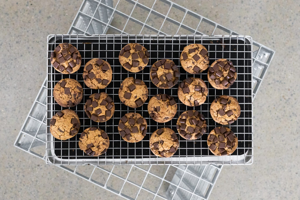 5. Ofen auf 170 °C Ober-/Unterhitze vorheizen und für mittelgroße Cookies je 8 Stück 55-g-Teigkugeln (oder 12 Stück zu je 35 g für kleinere Cookies) auf das Blech setzen. Auf ein zweites Blech 12 weitere Cookies setzen.