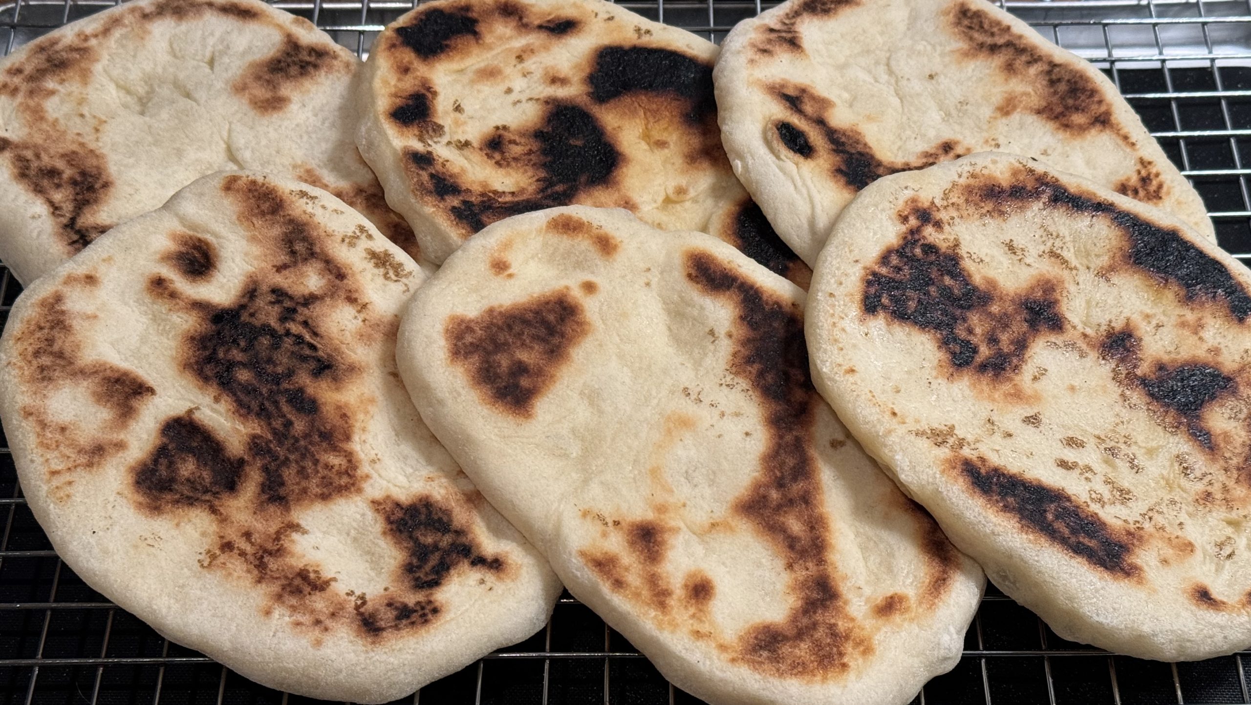 3. Teigportionen mit der Hand oder dem Nudelholz zu einem Fladen ausrollen und in einer Pfanne von beiden Seiten backen.
